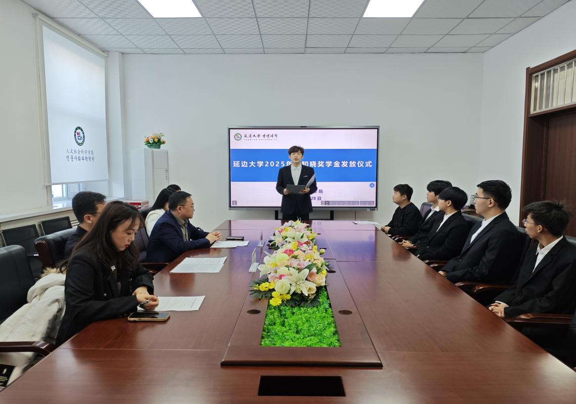 2025年11月28日上午,延边大学2025年度“知晓奖学金”发放仪式在人文楼218会议室举行。学院党委书记孙笑言、党委副书记朴龙国,学工办主任及各专业辅导员出席仪式,获奖学生代表共同参加。仪式由学工办主任张耀月主持。
