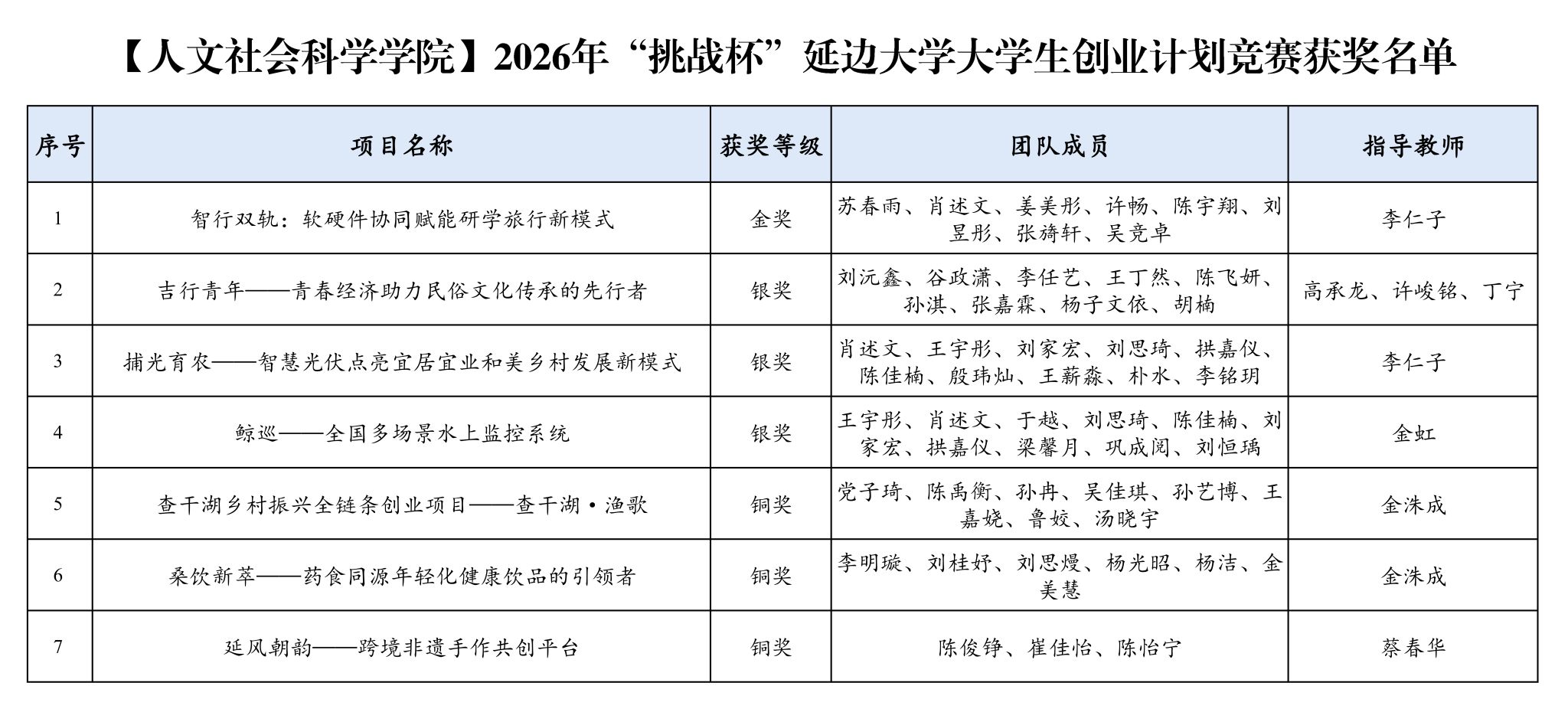 近日,2026年“挑战杯”延边大学大学生创业计划竞赛圆满落幕。人文社会科学学院在本次校级竞赛中取得优异成绩,充分展现了学院学子扎实的专业素养与昂扬的创新风采。